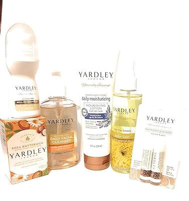 Generic Yardleys Self care package, includes Roll-on Deoderant, Shea Buttermilk Bath Bar, Daily Facial Cleanser, Daily Moisturizing Lotion, Fragrance Body Mist, and Moisturizing Lip Balm, Beige